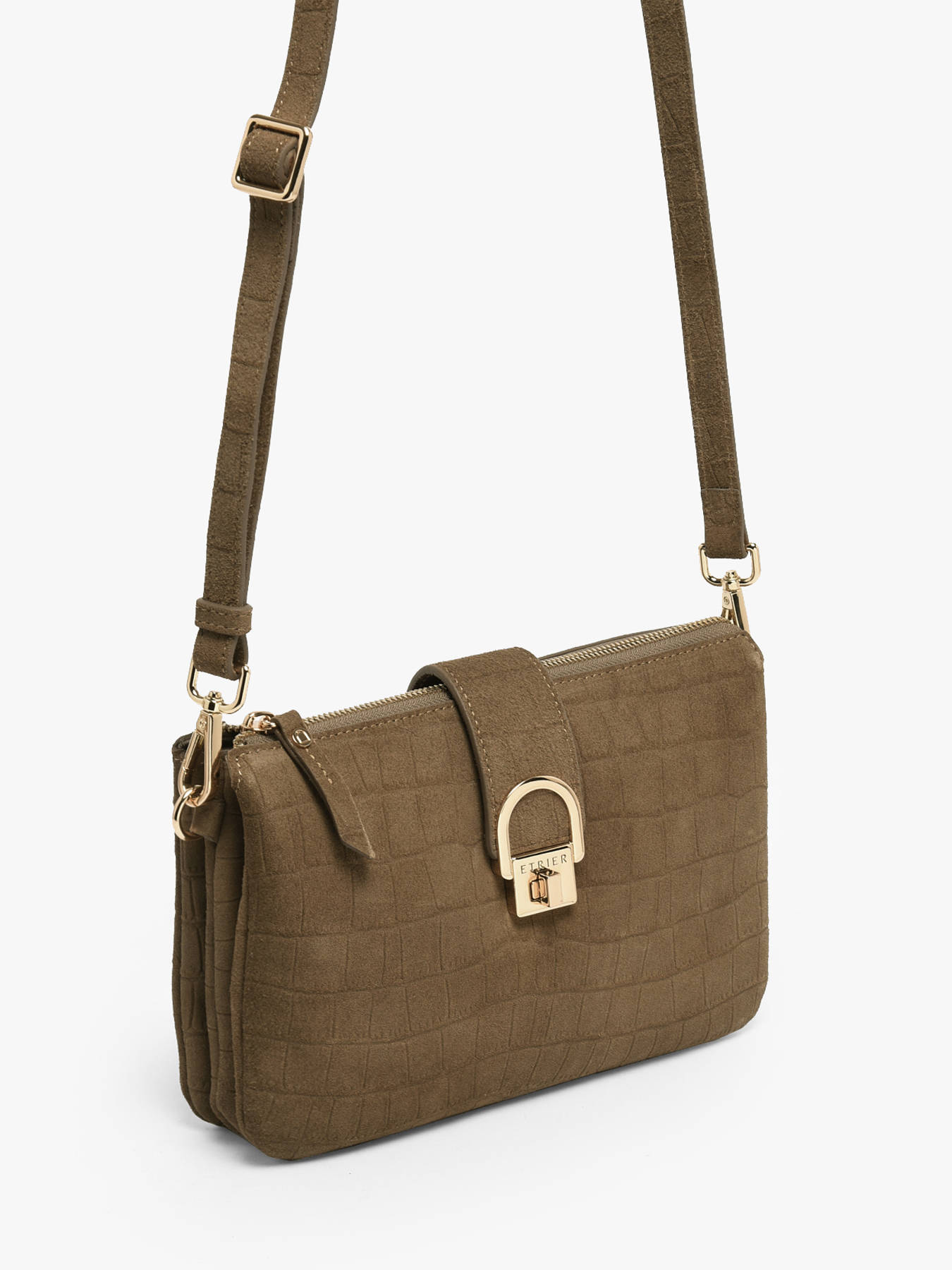 Le sac bandoulière EQUESTRE CROCO d'Etrier se distingue par son cuir de vachette velours imprimé crocodile, un mariage audacieux de textures qui apporte sophistication et charme sauvage à chaque modèle. Ce sac allie élégance et fonctionnalité avec sa fermeture zippée, son rabat à fermoir et sa bandoulière réglable et amovible, vous offrant plusieurs façons de le porter en toute simplicité. À l'intérieur, trois compartiments bien organisés vous permettent de ranger vos essentiels avec soin, complétés par une poche simple et une poche zippée pour une meilleure organisation. Les finitions dorées apportent une touche raffinée qui sublime ce sac, parfait pour celles qui cherchent à allier style intemporel et caractère affirmé. Le sac Equestre Croco est un véritable bijou pour votre garde-robe, parfait pour accompagner vos looks au quotidien avec une allure chic et sauvage.